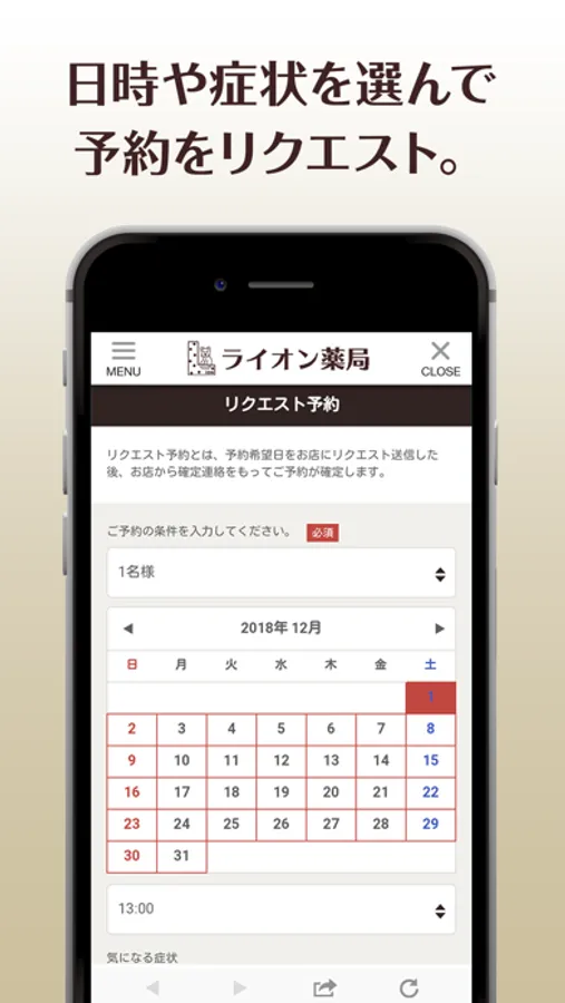 ●アプリから予約できます! ライオン薬局では、気になる症状についてのご相談を受け付けております。 ご希望の日時や気になる症状を選んでご来店の予約をリクエストできます。