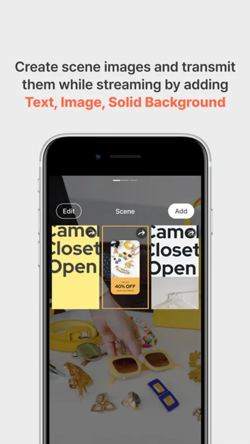 You can add any scene image you want on the camera and content screen(PDF). Create your streaming content by freely making Text, Images, and Solid Color Backgrounds.