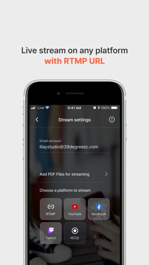 You can stream live on any platform that has RTMP URL. Stream freely to any platform such as Youtube, Facebook, Twitch, and more.