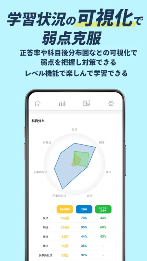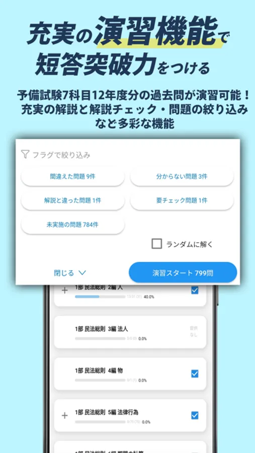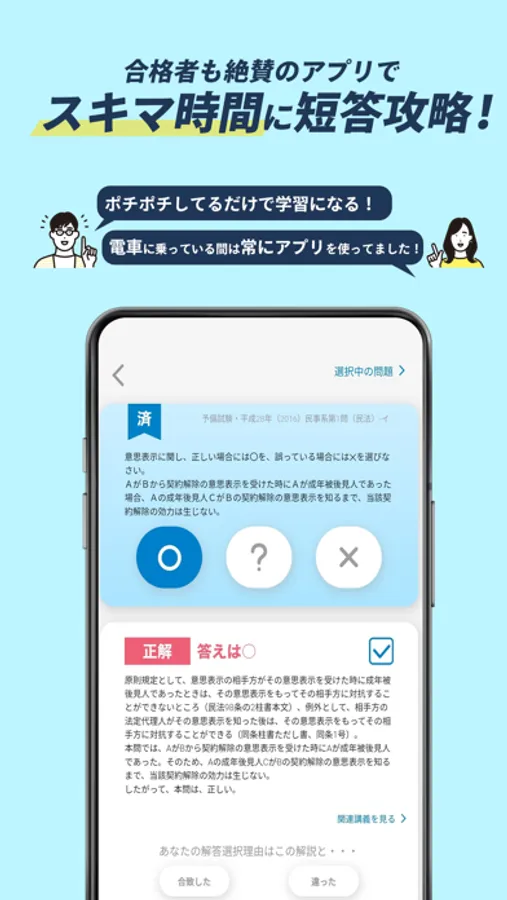 このアプリならスキマ時間にいつでもどこでも勉強できて、"合格者と同じ学習法"を実践できます。司法試験予備試験の受験生はもちろん、法学部生、法律系資格の受験生など、法律を学ぶすべての方必携のアプリです。