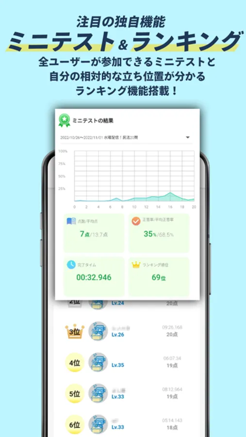 アプリ上で定期的に開催されるミニテストは全ユーザーが参加でき、実際の試験と同様の制限時間で問題に挑めます。さらに、ミニテスト開催期間終了後に全参加者の点数とタイムから、ランキングと点数分布を公開。他の受験生の中での自分の相対的な位置を知る事ができます。