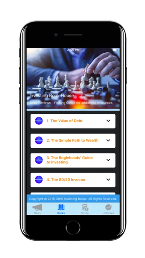 In this finance app, users can analyze daily news, view market charts, and check stock quotes. Includes market news updates, book reviews, and risk management tools.