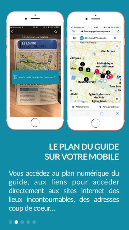 Vous pouvez vous géolocaliser, naviguer sur ces plans, repérer les sites et adresses des guides et consulter leurs descriptions. Pour y accéder, rien de plus simple ! Avec l'application, prenez en photo n'importe quelle page du guide et vous pourrez accéder au plan et à des liens vers les adresses.