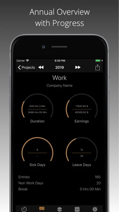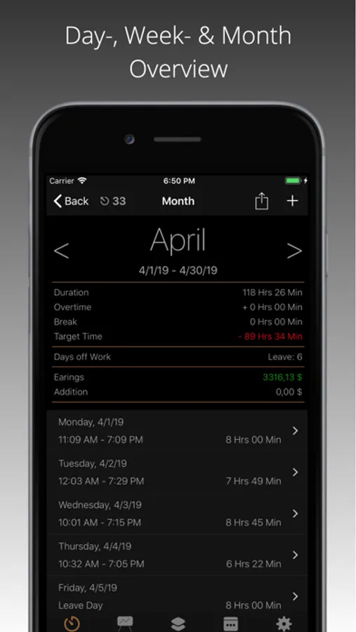 - Automatic calculation of breaks, working hours, overtime, target time and earnings