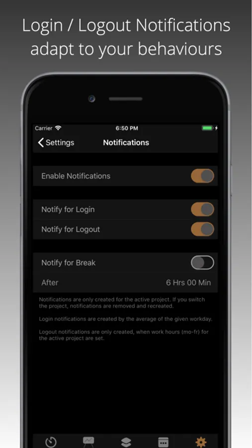 - Never forget to login / logout - FlexLog learns from your behaviour and reminds you to login / logout every single day (Notifications)