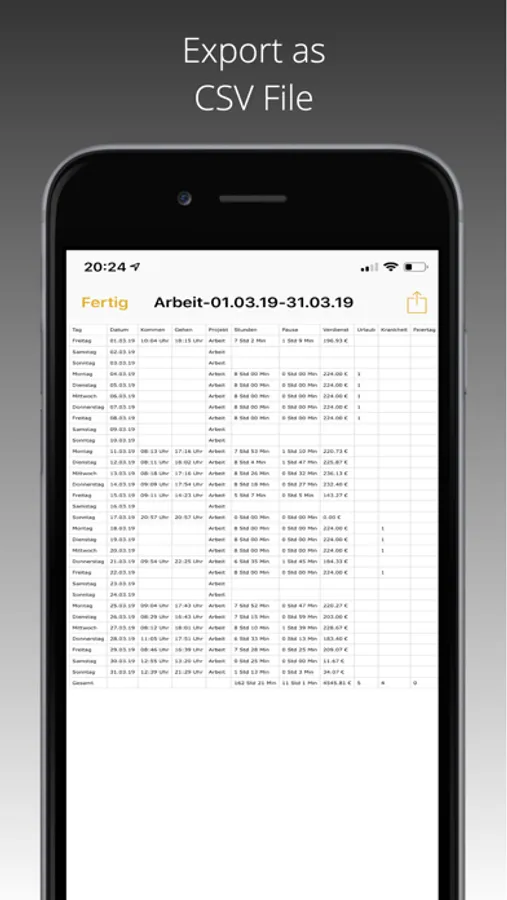 - Export your work time as CSV via email, share your work time in Excel, Numbers, ... (daily, weekly, monthly or yearly)