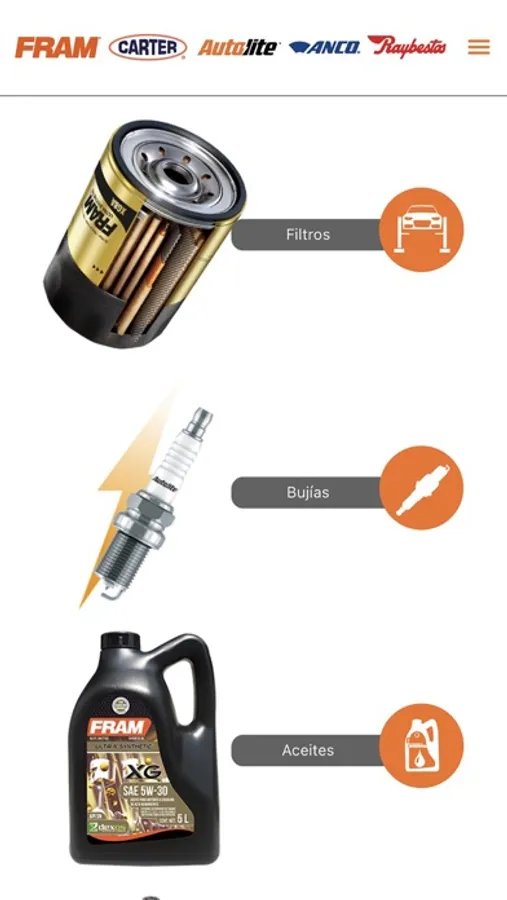 Encuentra todos los productos que necesitas para realizar la afinación del vehículo en las mejores marcas FRAM, Autolite, Carter, Anco, Raybestos y Lusac. Nuestra aplicación te indica los filtros, bujías, aceite, bombas de agua, balatas, rotores, tambores, hidráulicos y limpiaparabrisas que requiere un vehículo, así como: guardar en favoritos los productos que más te interesan y accede rápidamente a tu lista, agrega tus vehiculos favoritos, intercambios contra la competencia, fichas técnicas de nuestros productos, noticias y lanzamientos de nuevos números, el whatsapp y teléfono de contacto con Servicio Técnico, links a nuestras redes sociales y wallpapers para que personalices tu dispositivo.