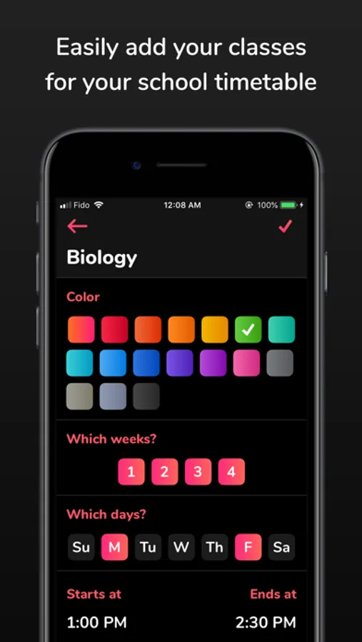 - If you have a very mixed up schedule with the same class at different times on different days, no need to add the same class multiple times. Simply add a variation and choose the days and time. Variations can be given a name too!