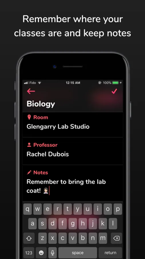 - Add room and location, professor name, phone number, email and other information for each class with notes