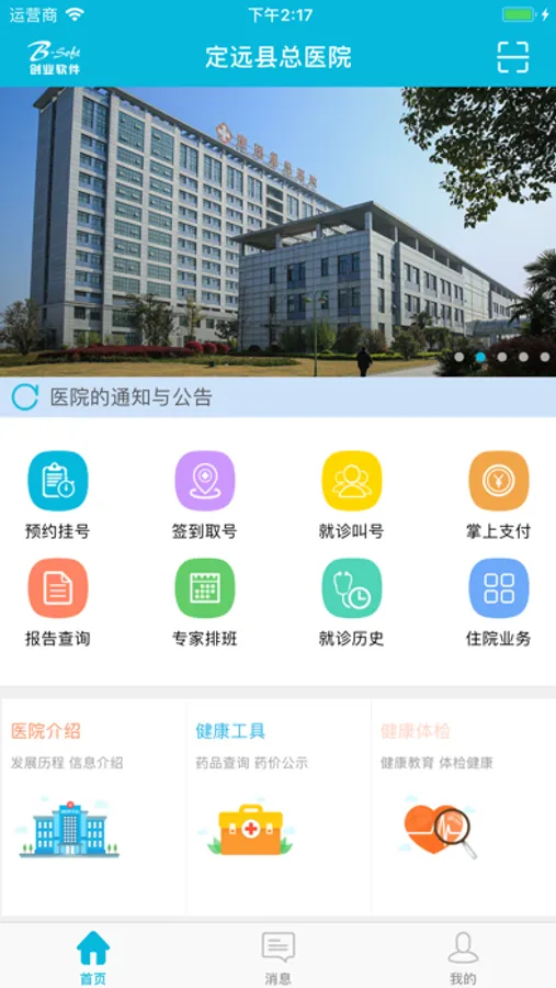 定远县总医院患者版APP可以随时随地享受“预约挂号、签到取号、排队叫号、掌上支付、报告查询、专家排班、就诊历史、住院业务”等业务功能。