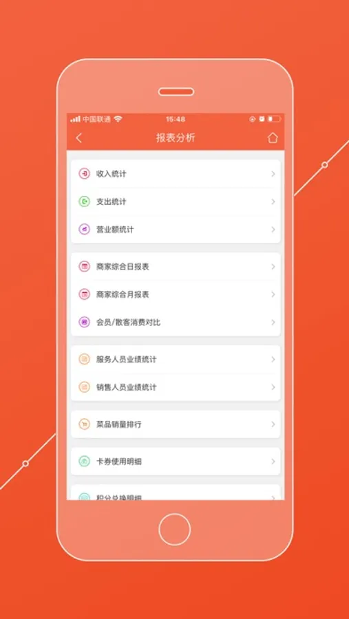 收入统计,利润统计,支出统计,日报月报,绩效提成,消费排行,充值排行,余额排行,积分排行,销量排行...