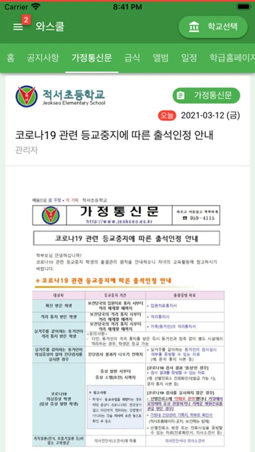 * 가정통신문 : 가정통신문을 확인할 수 있습니다.