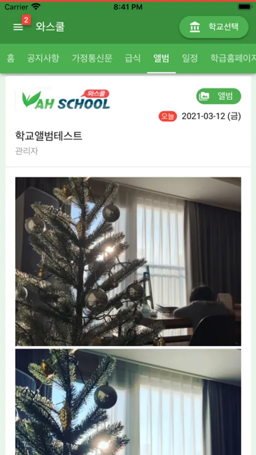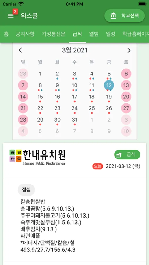* 홈 : 오늘일정, 오늘의 식단, 오늘의 알림장, 최신 주간학습안내 그리고 최근 공지사항과 가정통신문을 확인할 수 있습니다.