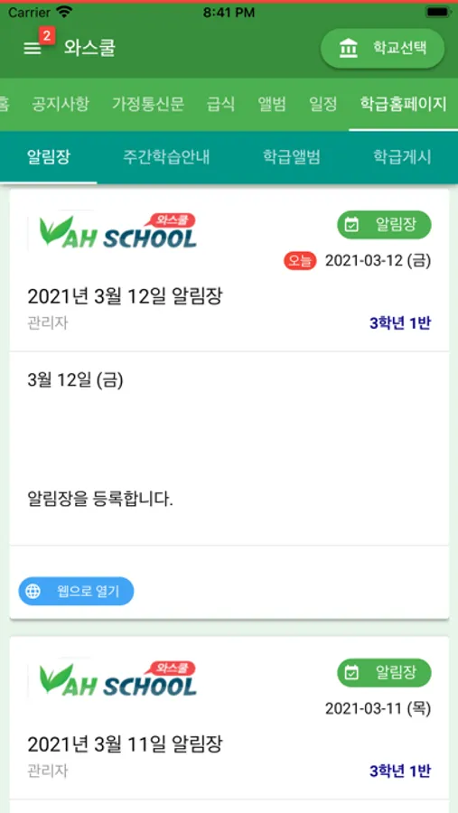 * 알림장 : 학급의 알림장을 확인할 수 있습니다. (학교 홈페이지에 가입된 회원 전용)