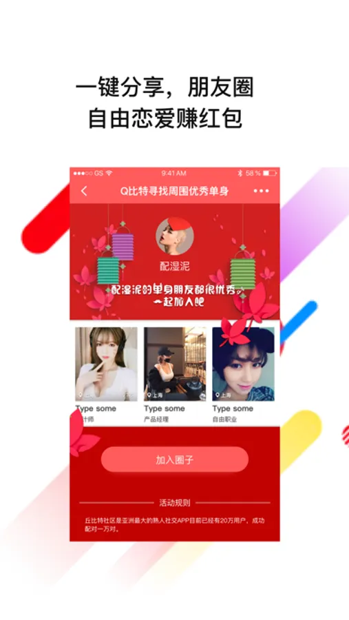 丘比特是神圣的天使,每个人都可以成为丘比特。把不同的朋友圈连在一起,让陌生的男女彼此认识,牵线搭桥让他们认识靠谱的人,参加有趣的活动。