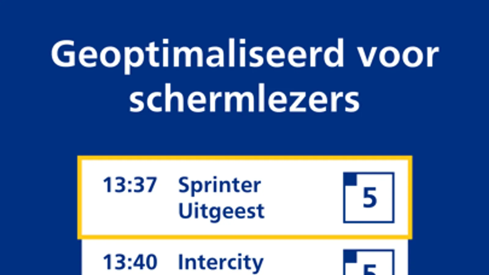 In de NS Perronwijzer vind je de informatie over de eerstvolgende trein die vertrekt op het perron waar jij je bevindt. Zo kun je een laatste check doen of je in de juiste trein stapt als je de informatie op de borden boven de perrons niet of lastig kunt lezen. Heb je spraak geactiveerd op je telefoon? Dan leest de app ook voor wat er op de borden boven de perrons staat. Dat werkt heel eenvoudig: al met een paar kliks hoor je de belangrijkste reisinformatie van het perron waar jij je bevindt.