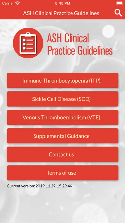 The ASH Practice Guidelines app provides easy access to every recommendation from all guidelines published by the American Society of Hematology (ASH), including rational for each recommendation and benefits and harms associated with each recommended course of action. The app currently includes guidelines covering venous thromboembolism (VTE), sickle cell anemia (SCD), and immune thrombocytopenia (ITP). The app also provides access to other tools and resources designed to aid in clinical decision-making, including links to the published guideline manuscripts, ASH Choosing Wisely lists, the ASH Consult a Colleague program, and the ASH Pocket Guides app.