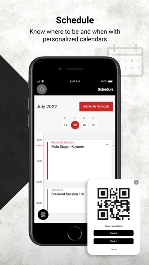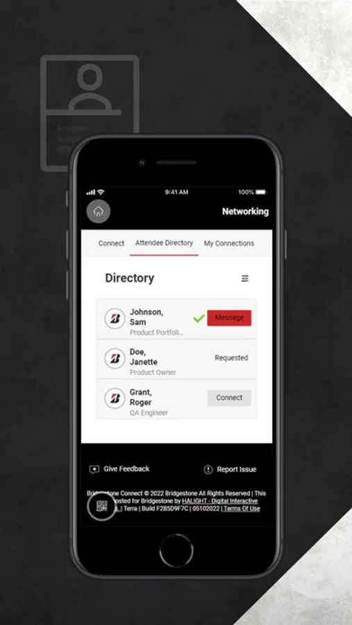 The Bridgestone Connect mobile App is your all-access pass to in-person events providing support for your event from start to finish. Track your schedule, check in to sessions, and network with your peers all in one place. Climb the leaderboard and compete for points with your fellow attendees by completing engagement activities throughout the event. Connect with exhibitors at vendor shows through in-person and digital interactions all while staying informed through the easy-to-use event messaging system.