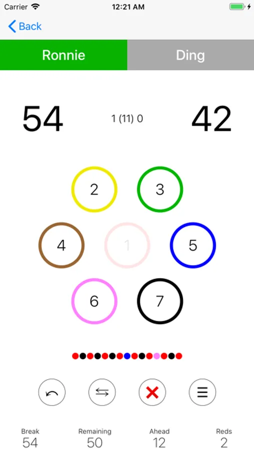 - In-Game Statistics: Scores, Frame scores, Current break, Remaining points, Remaining reds, Ahead/Behind points
