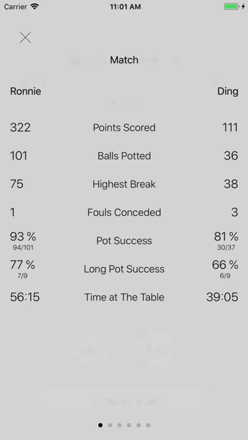 - Statistics of the Frame and Match: Points Scored, Balls Potted, Highest Break, Foul Count, Pot Success, Long Pot Success, Time at the table.