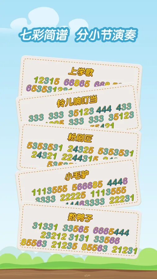 小毛驴、数鸭子、捉泥鳅、茉莉花、找朋友、哈巴狗、小兔子乖乖、铃儿响叮当、上学歌、七子之歌、小星星、两只老虎、粉刷匠等多首宝宝耳熟能详的儿歌童谣,跟着弹出的节奏唱起来