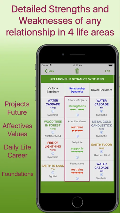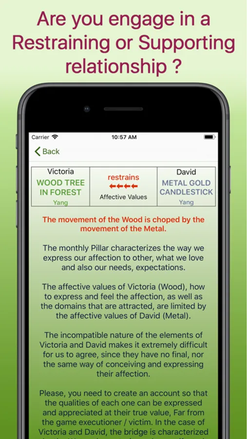 In each of the 4 life areas covered by the app, you will see right away if you are involve in a "Restraining" or "Supporting" relationship.
