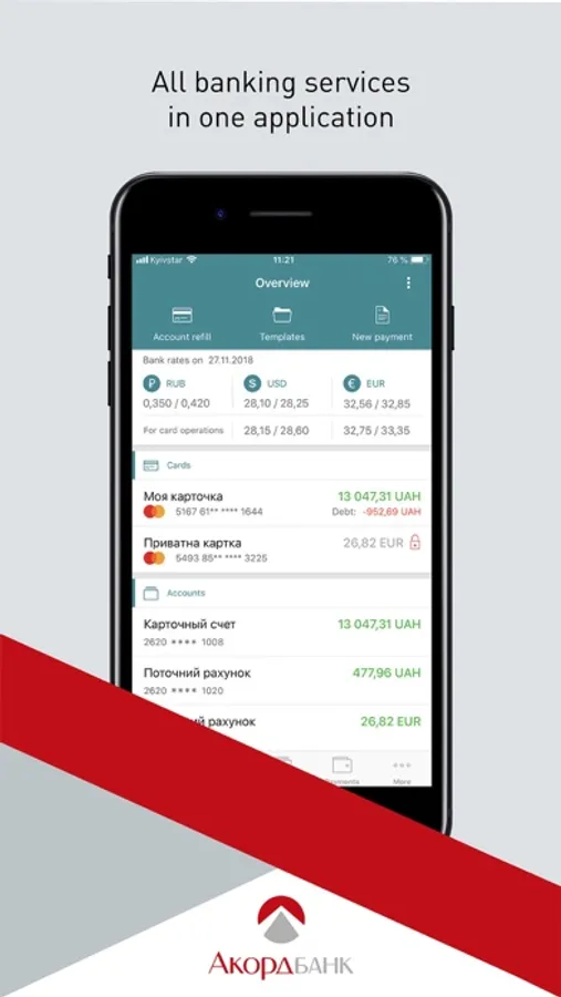 The Accordbank Mobile app is a safe and convenient banking service in your smartphone. Get 24/7 access to your accounts and banking products without breaks and weekends, using only you smartphone with Internet access. Wherever you are, you can independently process many operations that were previously available only at the Bank branches.