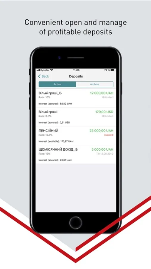 The Accordbank Mobile app allows you to be aware of the accounts status and transaction history, monitor the exchange rates, receive notifications from the Bank, and also conduct the following transactions: