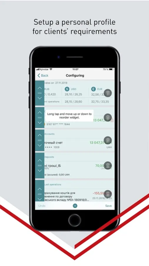 You can enter the Accordbank Mobile app conveniently and safely using your own fingerprint (Touch ID) only or using face recognition technology (Face ID). This solution is available on the devices with turned-on of the biometric technology. Using the widgets interface technology, you can easily and conveniently customize working space of your mobile application.