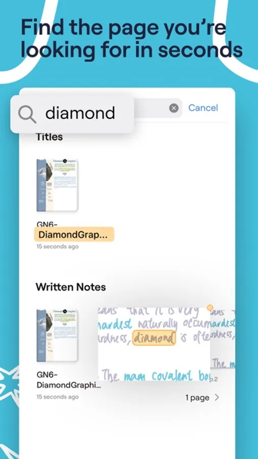 ■ Always find what you’re looking for. Search your handwritten notes, typed text, PDF text, document outlines, folder titles, and document titles.