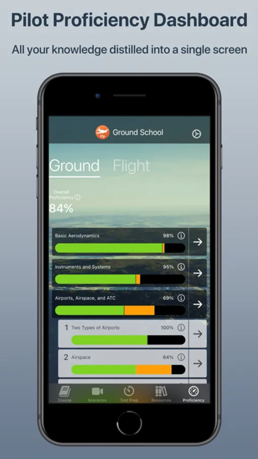 ・ The Pilot Proficiency dashboard that distills all of your interactions with Ground School into a single screen showing areas where you are strong as well as others that need work.