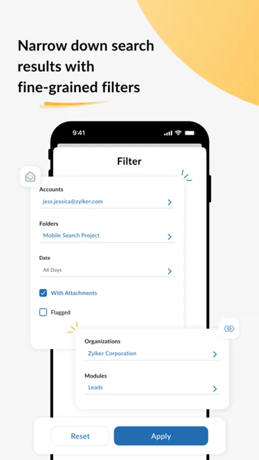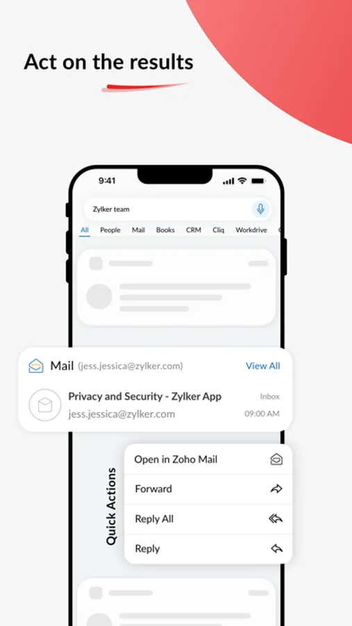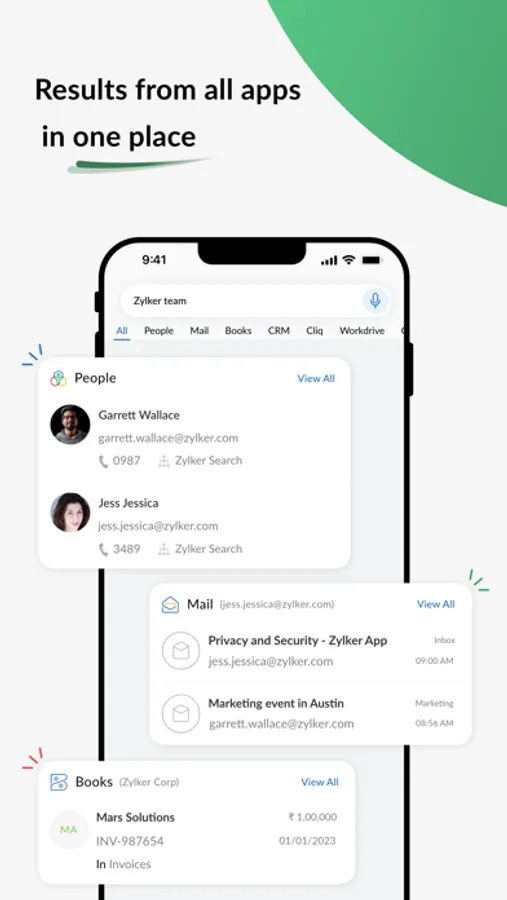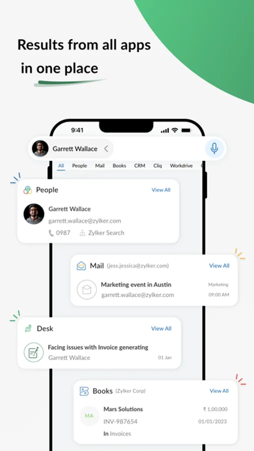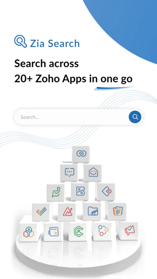 Zia Search - A unified search app for 20+ Zoho apps. With Zia Search, you can fetch results from Zoho CRM, Mail, Desk, Books, Workdrive, Notebook and other Zoho apps in one go. No more switching between multiple apps to find relevant information.
