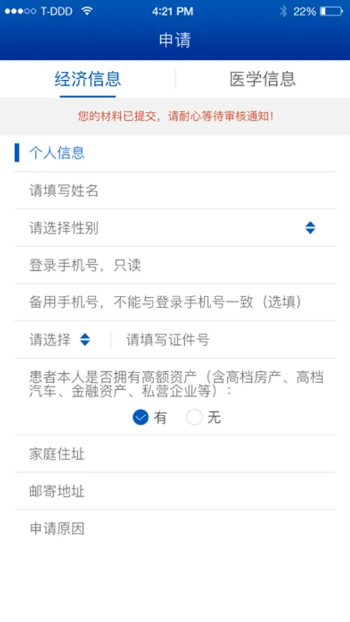 本应用为患者提供了经济材料上传、医学材料上传以及消息通知功能;