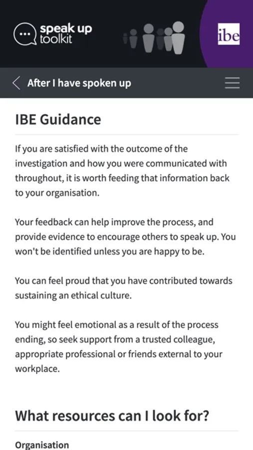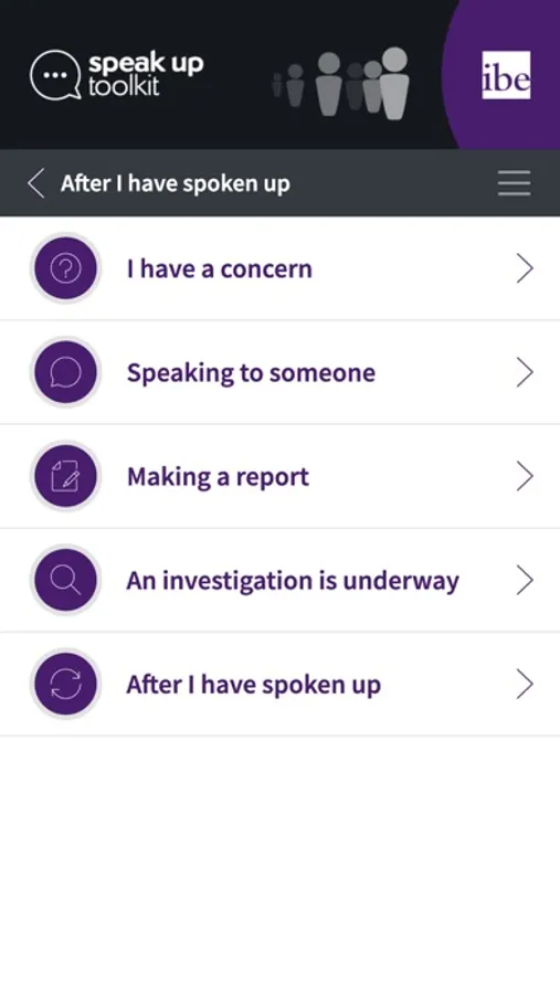 The IBE Speak Up Toolkit, devised by the Institute of Business Ethics, helps you to prepare for raising a concern. It covers the whole speak up journey – from noticing a problem and having a conversation through to what to expect if you call a Speak Up helpline or if your concern is investigated.