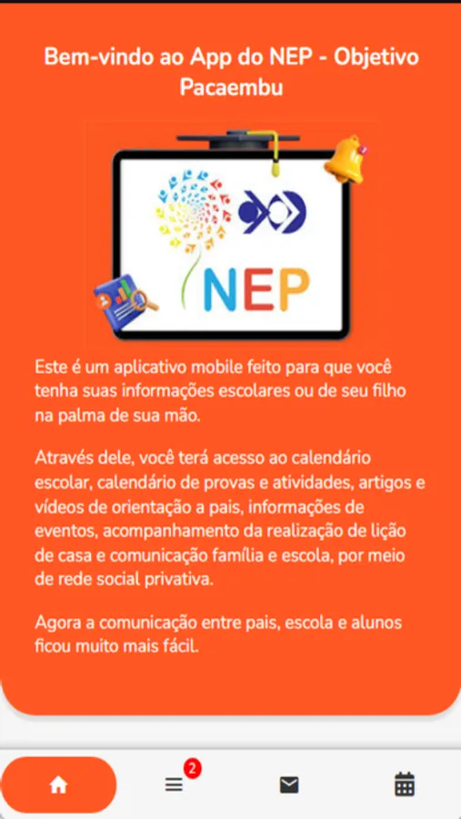 Através dele, você terá acesso ao calendário escolar, calendário de provas e atividades, artigos e vídeos de orientação a pais, informações de eventos, acompanhamento da realização de lição de casa e comunicação aluno/família/escola, por meio de rede social privativa.