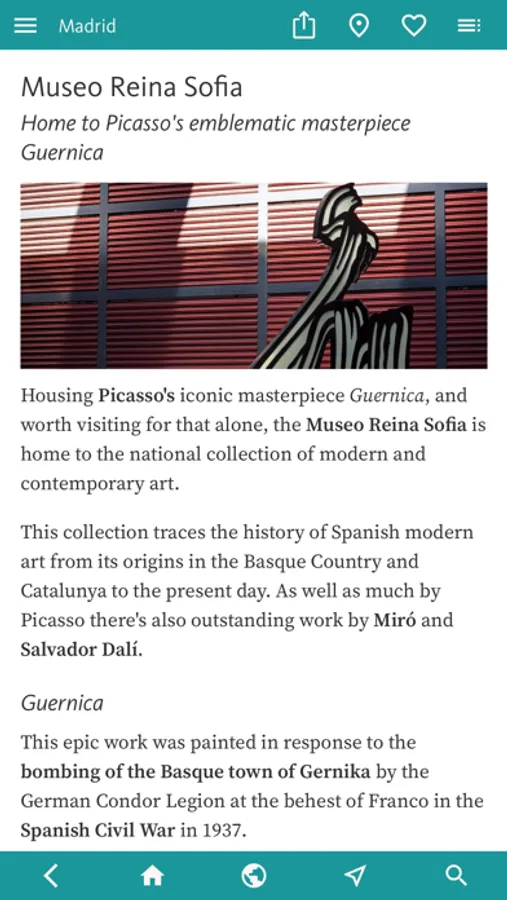 Or just dive right in to a section on SIGHTS & ACTIVITIES, organised by INTEREST. For art fans there’s the delight of the Prado, Reina Sofia and Thyssen-Bornemisza as well as a host of smaller galleries.