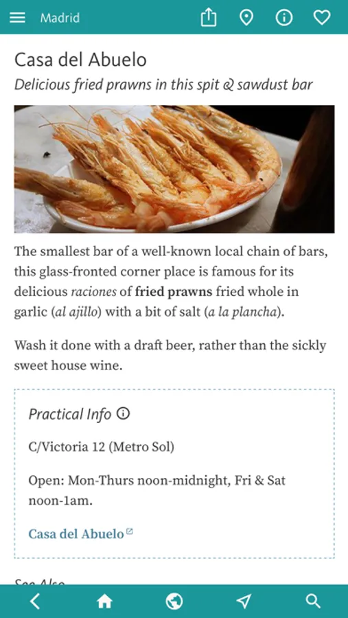 The app will help you live like one by making authentic RESTAURANTS tapas bars easy to find, and by suggesting after-hours activities in clubs, theatres and more. But we haven’t forgotten to recommend SHOPS for souvenirs either!