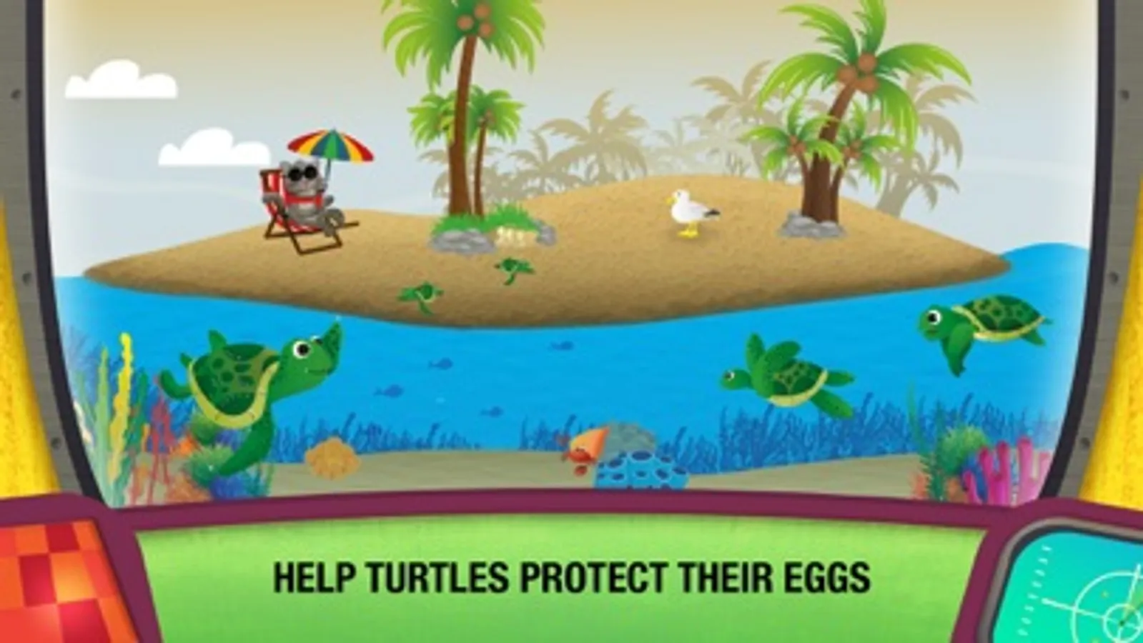 Feed the turtles and watch them lay eggs. Help the younglings to get out of the egg, and make sure the turtles don't eat the plastic bags, as they sometime mistake them for jellyfish. Look at the remoras — they always hitch a ride on the turtles.