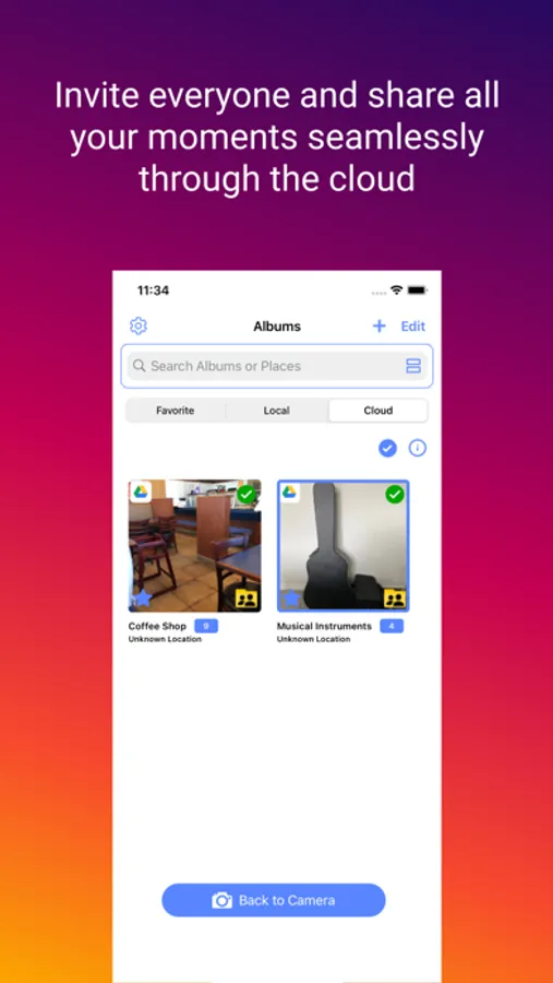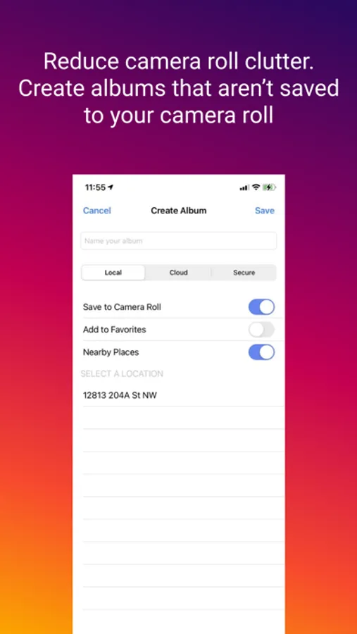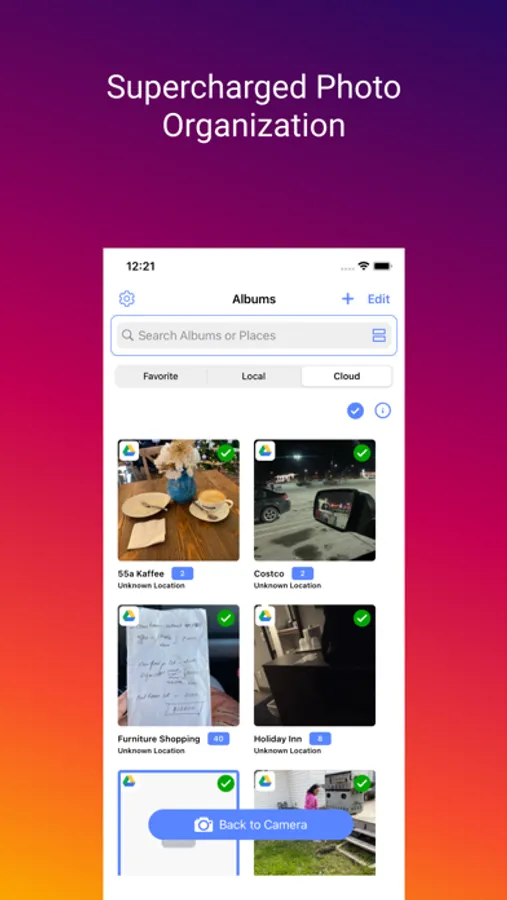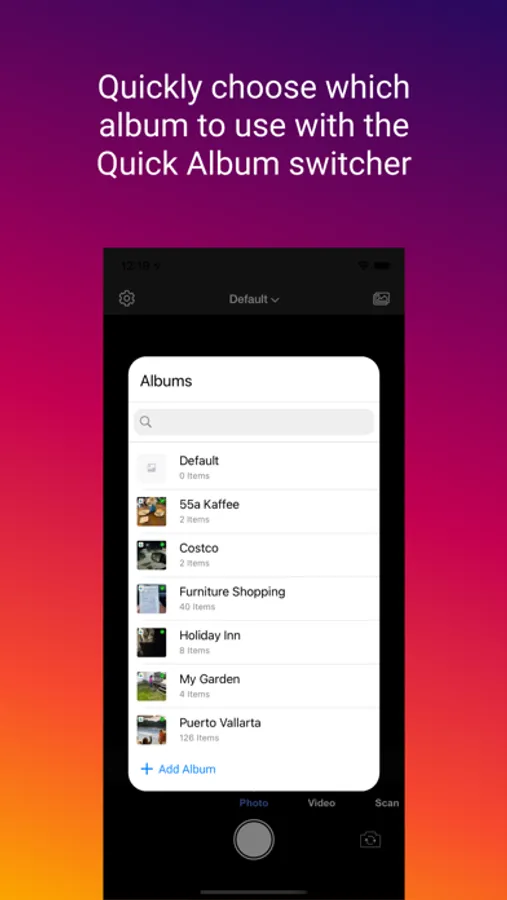 3. Hassle free organization. Choose an album and start shooting. Everything is automatically put in to the album as you take them so you never have to organize your photos or videos again after the fact and can finally stop endlessly scrolling to find that photo or video!