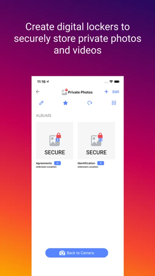 1. Secure Digital Locker. Create a secure digital locker for storing sensitive photos, videos and scans that are only accessible by you. Nothing in your digital locker is available on your camera roll so you never have to worry about prying eyes