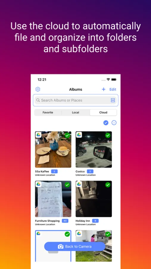 Presto Album! is an amazing app that saves you time by automatically organizing photos and videos into albums as you take them, gives you the ability to create a secure digital locker for storing sensitive photos, videos and scans that only you can access, turns your cloud service into your personal photo album filing cabinet and even has a built-in scanner so you don't have to leave the app to scan someones business card, a rental agreement or anything that you need to scan!