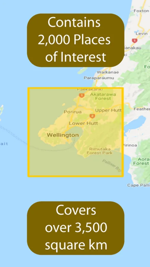 This version for Wellington, on New Zealand's North Island, locates places around the city and surrounding areas, extending from Paekakeriki in the North to Lake ferry in the East. This is an area of over 1,500 sq miles (3,500 km2).