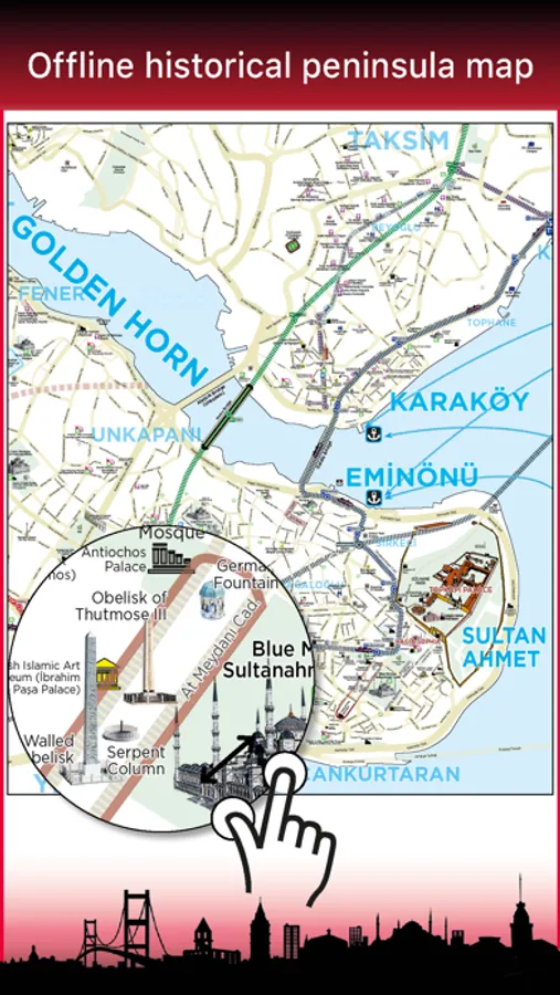 1- A hand-drawn and offline map of the historical peninsula of Istanbul that contains historical and touristic places such as Topkapı Palace, Hagia Sophia, Hippodrome, Sultanahmet, Grand Bazaar, and Eminönü.