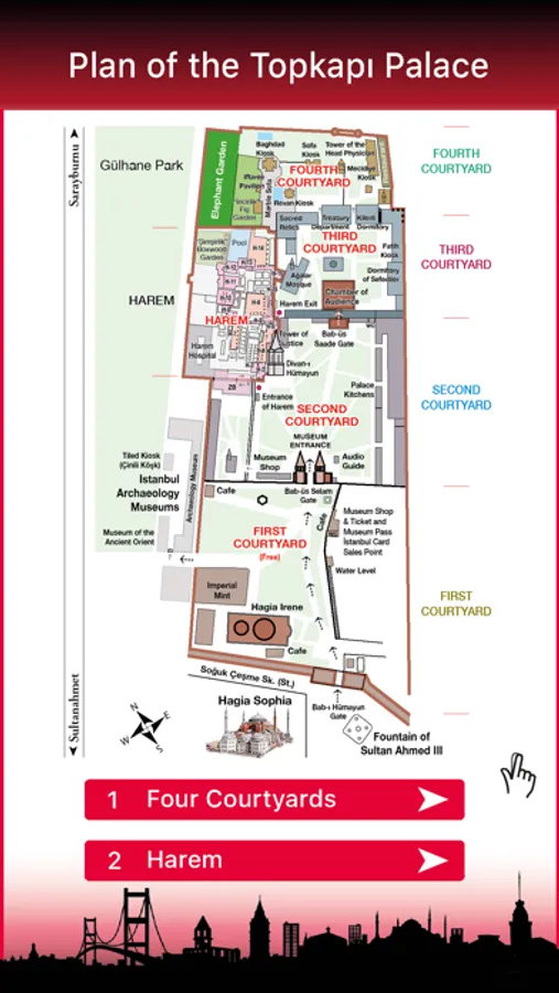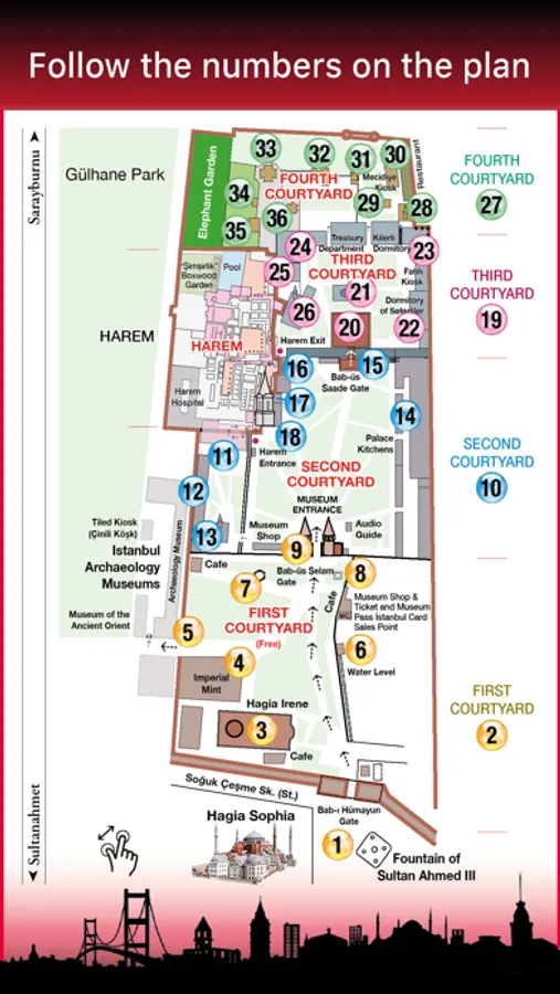 3- Separate enumerated schematic plans of the museum’s sections including all four courtyards and Harem.