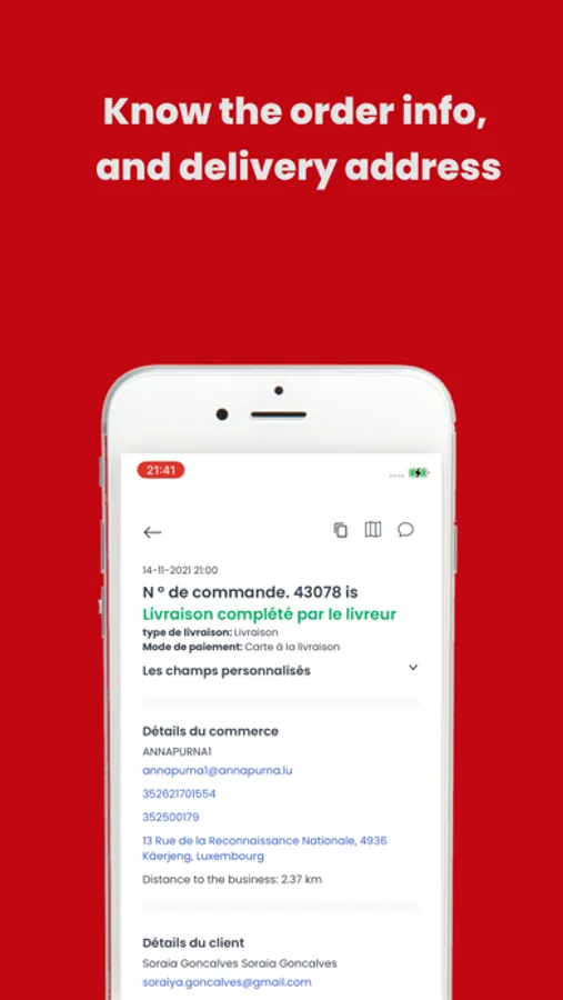 Lorsque vous acceptez la commande, l'entreprise et le client recevront un e-mail de confirmation des détails de la commande, la date et l'heure de livraison, le mode de paiement, les coordonnées de votre entreprise et les coordonnées du client.