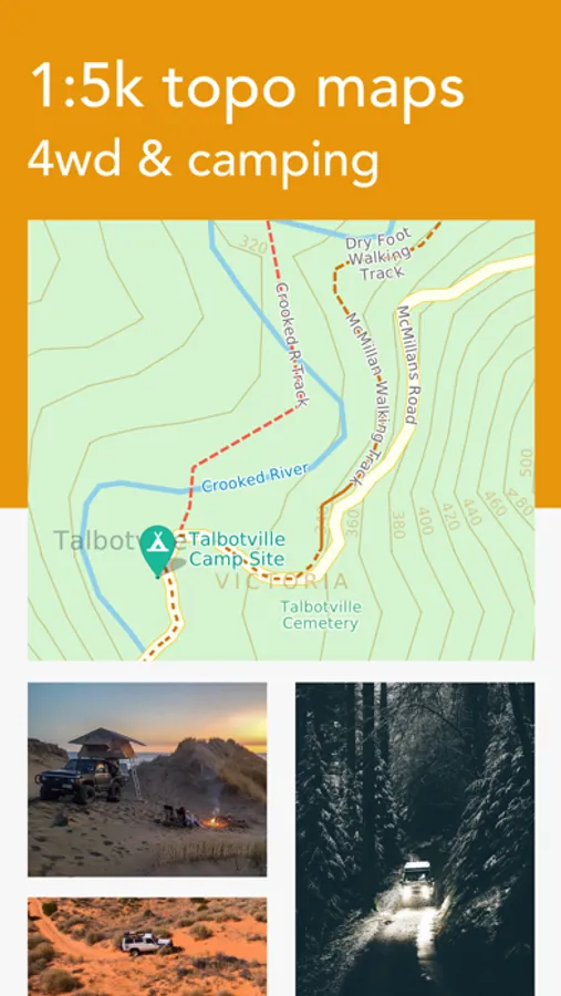 On an iPhone or iPad, the best in class 4WD Topo map come to life, rendering Roads, 4WD Tracks, Fire trials, Points of Interest and Terrain topography in stunning levels clarity.