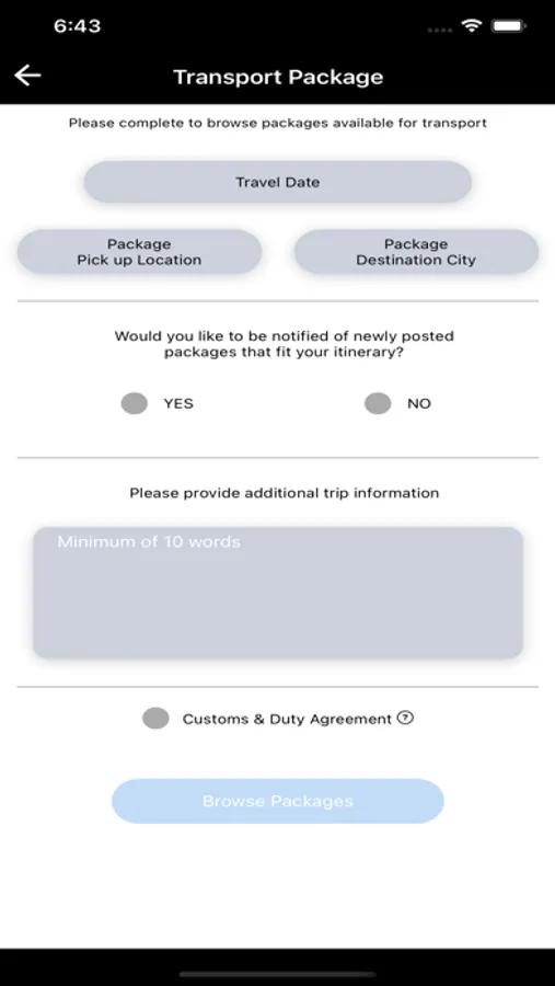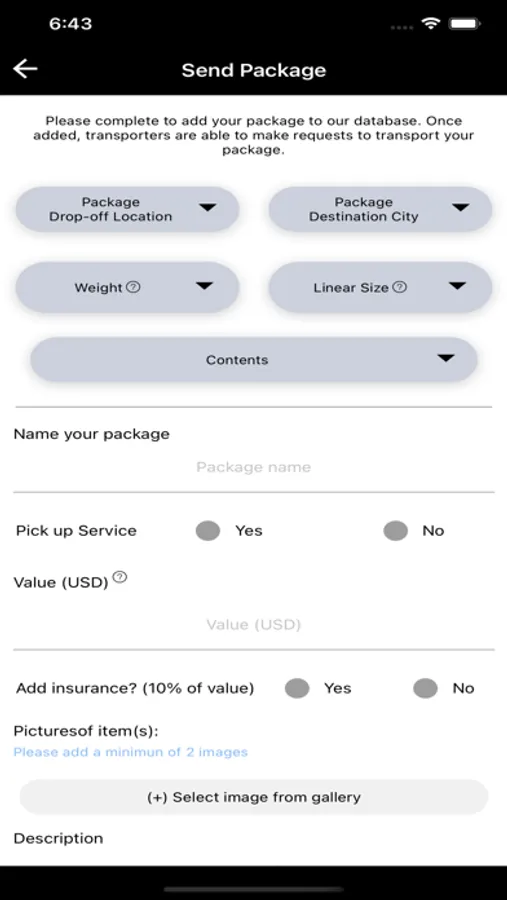 Download our free app and register, once approved click send icon, enter package details and click post. Transporters will be able to view your request.