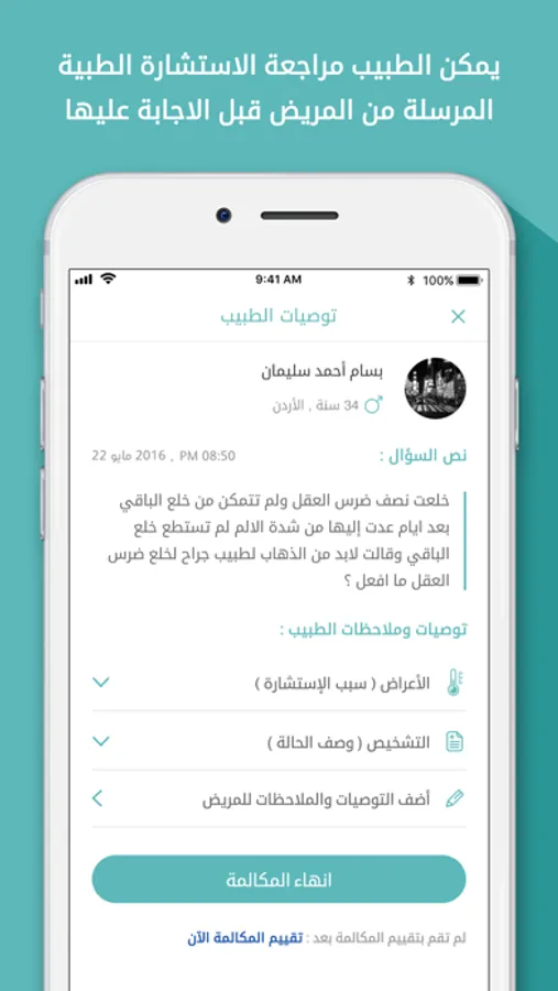 إرسال التوصيات الطبية للمريض بعد انتهاء الاستشارة.