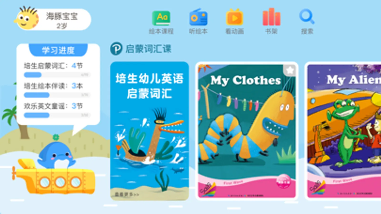 国内第一套以英文绘本动画为教学内容的AI互动主题词汇课。