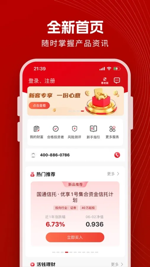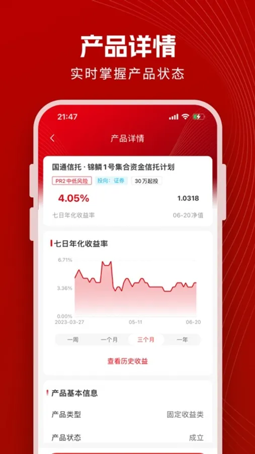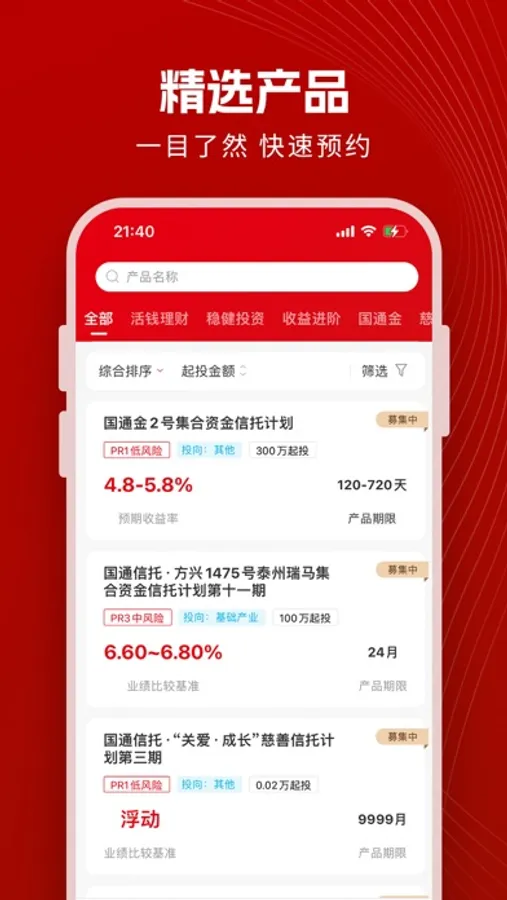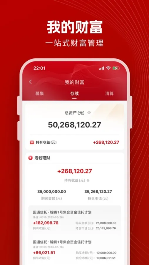 国通信托有限责任公司,是经中国银监会于2010年1月批准重组成立的非银行金融机构,公司致力于不断提升核心竞争力和可持续发展能力,为“成为专业引领、持续创新、受人尊敬的一流信托企业”愿景而努力。国通信托财富管理APP是专为高净值客户打造的集产品在线预约、远程双录、电子签约、账户查询、活动预约等服务的优质在线理财平台。